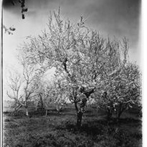 Photo, black and white: Plum trees in bloom at Gold Ridge Experiment Farm. Trees are identified as plum L-33 "Great Yellow,""Best Yet" and "Giant Yellow." March 11, 1929.