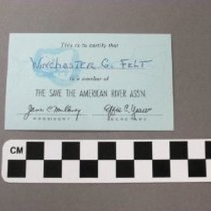 Membership card, for "The Save the American River Association," for Winchester Felt, no date. Blue cardstock.