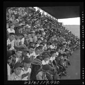 SERIES. Large group of player sitting in stands. Next is six players watching a player practice his fielding.