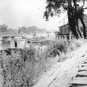 Steamers and barges on the river. View is from railroad tracks along the shore.