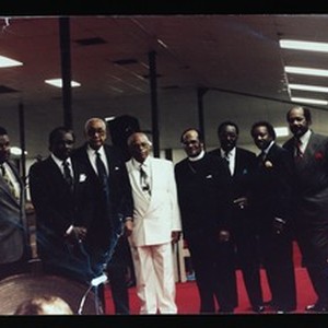 Photograph of Texas Bishops at interjurisdictional meeting, [s.d.]. L-R: Bishop William Watson, Bishop J.N. Haynes, Bishop T.D. Iglehart, Bishop N.H. Henderson, Bishop J. Edward Lee, Bishop David Houston, Bishop A. LaDel Thomas, Bishop F.W. Smith. [Description English/roman)]