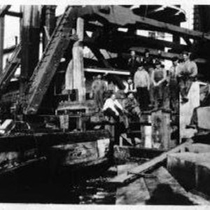 Print, 4" x 5". Constructing river levees. The Dredger Argyle. Capt. Manuel Brown top left. Victor Dias Silva on the right.
