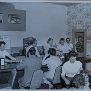Photo--black and white: Sebastopol Lions Club scrapbook photo: Lions Club Pancake Day at Johnny and Anne's Restaurant circa 1955. L-R facing camera: Mr. Offutt, Hilmer Hansen, unk, Leslie Offutt, unk, Philip Instch and waitress at table, Billie Herring. Photo by K-D Studio and Camera Shop, Sebastopol.