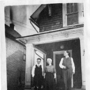 Two unidentified men and a women stand on the front steps of a home.