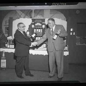 Two men shaking hands and holding bottles of Bellows whiskey standing in front of a Bellows whiskey display.