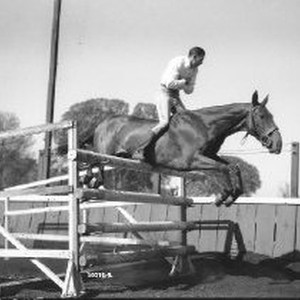 Man on horseback jumps a hurdle with arms crossed and no saddle. Probably at the California State Fair.