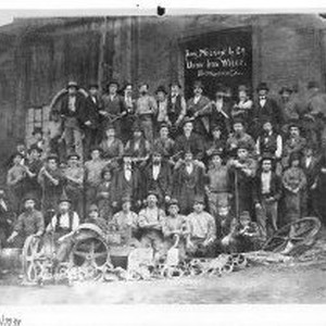 Union Iron Works or Root, Neilson & Co. staff and workers posed in front of the building