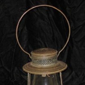 Kerosine lantern with brass metal base and smoke shade, clear glass chimeny, and bale handle. Dietz No. 74.