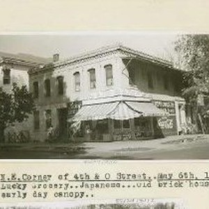 Typed on binder page "N.E. Corner of 4th & O Street..May 6th, 1950. Lucky Grocery ..Japanese...Old brickhouse with early day canopy.."