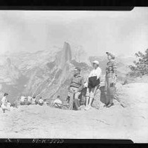 An unidentified group of people sitting on the wall of a view point at Yosemite.