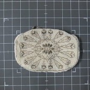 Purse, beaded, rayon and glass beads, white, 5-1/4 in x 7-1/2 in. Beaded all over with white beads with geometric design worked in gray beads and pearls. Zipper closure, hand strap on one side, small square mirror in inside pocket, label on pocket "Made in Czeckslovakia". c.1938