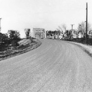 View of a completed bridge (in distance) with a gravel approach in foreground (probably still needs paving).