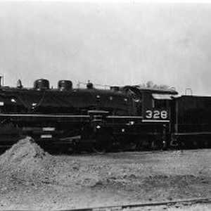 Western Pacific Locomotive # 328 at the Western Pacific Repair Shop, Sacramento Calif. The locomotive is a 2-8-2 Mikado built by the American Locomotive Co. and appears to be freshly painted. Date of photo is unknown.