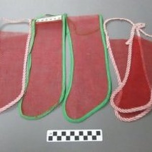 One Christmas tree ornament, Christmas stocking, red cotton net, 10 in x 13 in, c.1950s