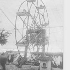Postcard--black and white: A 1912 Gravenstein Apple Show exhibit of a Ferris Wheel made of apples. Message on verso.