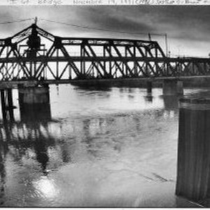Photo caption printed in the Sacramento Bee on April 13, 1982 states: "The Nov. 19, 1981, (subject) picture . . . shows a more placid Sacramento River, and the I Street Bridge with ample clearance for small vessels. Such was not the case Monday, . . . when the bridge had to be opened for a houseboat, left. The water level hovers just below the bridge, and the rampaging river is choked with debris, . . . Runoff from recent storms has left Northern California rivers overflowing their banks."