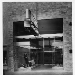 Exterior view of the entrance to Green's Furs and Fashions at 1016 K Street, southside. Neon sign visible above the entrance