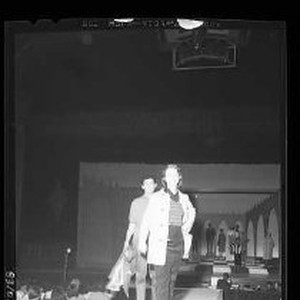SERIES. Views looking down on to stage and audience. Views of different models walking on stage, Models are men, women and children.