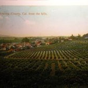 Photo--hand colored: Enlarged copy of a vintage postcard showing the town of Sebastopol circa 1915s as seen from the western hills. Apple orchards are seen in the foreground with the town of Sebastopol in the background.