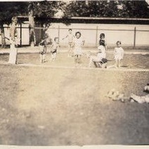 Young children playing in wading pool as older children observe. Building and trees behind. Located at either Muir or McClatchy Playground.