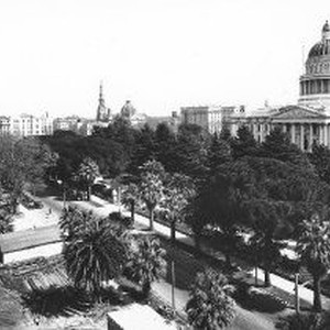 Elevated view of the State Capitol and grounds looking northeast from 10th Street at N St. Includes city skyline and ongoing construction of the Capitol Extension building, now known as the State Library and Courts building, across the street. High resolution scan available.