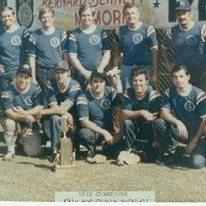 Sacramento Police Department Bureau of Investigation Softball Team poses for photo. They are the "1972 Champions, City and County Softball." Sign behind them says, "Bernard Bennett Memorial Picnic."