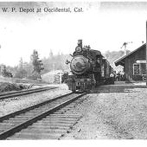 Photo, black and white: Northwestern Pacific (NWP) train and depot in Occidental circa 1907. The Northwestern Pacific Railroad, the 'Redwood Empire Route', played a major role in the growth of Northern California. The line was created in 1907 through the consolidation of six separate picturesque railroad companies held by the Santa Fe and Southern Pacific railroads. At its height, the Northwestern Pacific Railroad was an amalgamation of some sixty different companies. Some of the forerunners built extensive and substantial operating lines. Others, were short lines such as he many logging lines in the Humboldt Bay region. Nearly a third consisted of companies which incorporated but never laid a foot of track. All of them contributed, in some fashion, to the rich heritage of the NWP.