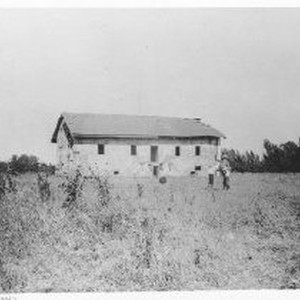 Sutter's Fort central building before rebuilding. View with a man and two boys standing next to the building.
