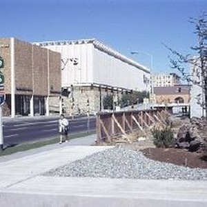 View of the approach to the subway beneath the Downtown Plaza Shopping Center. Macy's is on the left and the Bank of America in the center