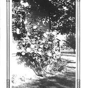 Print: black and white: A rose bush of Lillian Rosebook in Sebastopol. Caption on verso: "Lillian's rose bush in full bloom--so. West corner of her house."