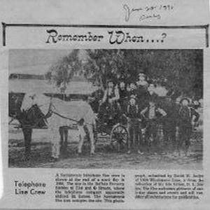 Photo printed in Sacramento newspaper showing a Sacramento telphone line crew in 1906. Site is the Buffalo Brewery Stables at 21st & Q. The Sacramento Bee now occupies the site.