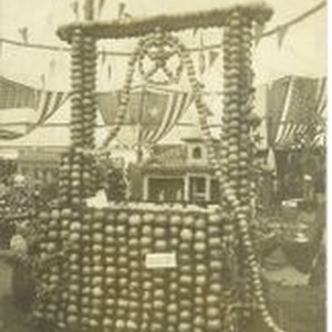 Postcard--black and white photo -Gravenstein Apple Show 1910--apple display of well made of whole and dried apples. In background display of bank building and Forestville School. The first Sebastopol Apple Show was held in a tent across from the Petaluma & Santa Rosa Depot in August, 1910 and promoted local fruit in various creative ways.