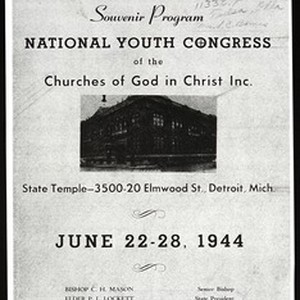 Program book for the 9th National youth congress, Church of God in Christ, State Temple, Detroit, Michigan, 1944 June 22-28. [Description English/roman)]