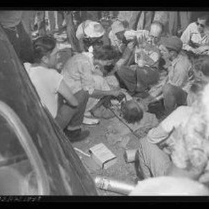 Auto accident - Woman attending to injured man on ground.