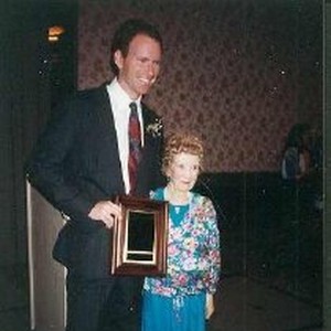 Edna Mae Burnam and Kevin Cranley standinga together, with Cranley holding a framed document. On the back is written "Kevin Cranley-Pres. of Willis Music gave me plaque. (Picture of cover of my Dozen A Day Book." Photograph removed from Scrapbook, 1989-1992, 2003/051/009.