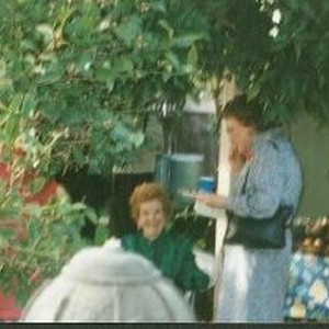 One woman stands next to Frances Burt, who is seated on a patio. From envelope labeled, "Pen Women at Frances' Birthday Party, March 23, 1997." Photograph removed from Scrapbook, 1993-1997, 2003/051/010.