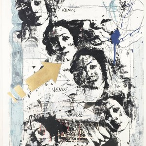Five faces of Sandro Botticelli's Venus cascade across the image among streaks, splatters, and abstracted forms. A golden arrow ascends from the left side of the image to the right, perpendicular to the descending Venus faces.