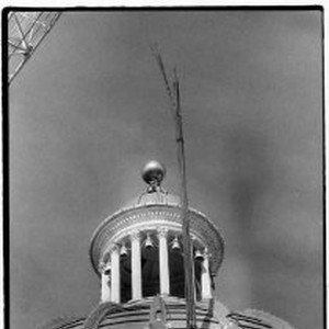 View of a workman guiding rebar through the California State Capitol dome. It is to be used to re-inforce the upper drum wall of the rotunda. It will be shot-creted, a cementing process.