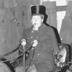 SERIES. Man wearing top hat and coat smokes cigar while driving a horse and carriage.