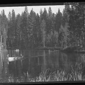 View of an unidentified mountain lake with people in row boats and a cabin at one edge of the image.