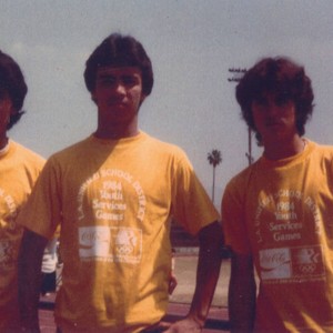 An unidntified person (left) stands with Paul Martinez (center) and Joey Ramos Jr. (right) wearing yellow event t-shirts at the Los Angeles Unified School District 1984 Youth Services Games opening ceremony, held at East Los Angeles College (ELAC); this event is sometimes referred to as the 'Junior Olympics.'