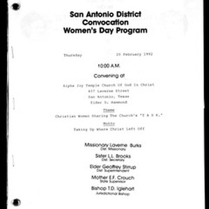 Convocation, San Antonio district, Women's day program, Texas, 1992 February 20. Also includes newsletter: The Kinko's communicator, vol. 2 (Spring 1992). [Description English/roman)]
