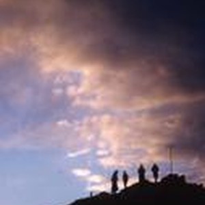 Slide shows four people standing on a summit during a sunset in Death Valley. Scanned with Epson Perfection V700 Photo as 3200 dpi TIFF image in 24 bit RGB color.