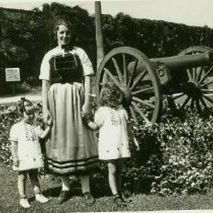 Woman poses with two small girls, all wear Swiss costumes. They pose beside a cannon in park in front of Sutter's Fort. The original container was identified as being part of a series about the 1939 Centennial Celebration.