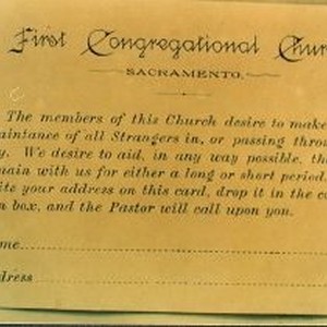 Church Visitor Registration Card for the First Congregational Church of Sacramento. This was probably the Woolsey's church. Found in the Woolsey trunk.