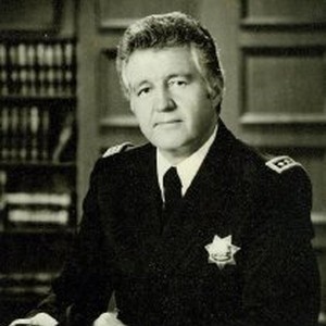 Studio portrait of John P. (Jack) Kearns, Sacramento Police Chief (1977-92). He wears uniform, holds hat in hand. Office setting.