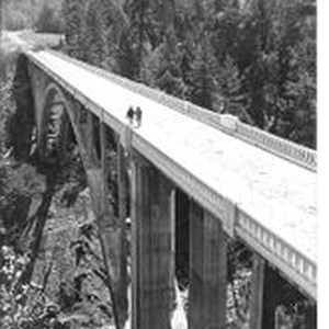 Postcard--photo--black and white: "Dan Creek Bridge, Redwood Highway." Tall arch bridge spans the Dan Creek . The big Dan Creek bridge on Old Highway 101 south of Leggett, Humboldt County.
