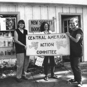 Women standing in front of New Society Bookstore hold sign for "Central America Action Committee." Two women identified as Joni Foster and Darien Dern (Dehn?).