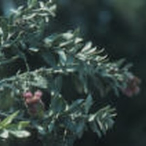 Grayish green stems with leaves and small pink flowers in bloom at Rancho Santa Ana Botanic Garden.