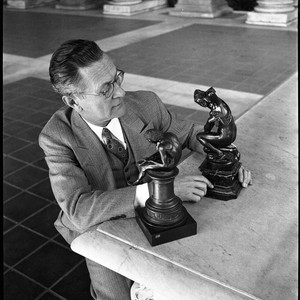Three-quarters length portrait of Maurice Block (Curator of Art, 1928-1948) examining bronzes on a table in the loggia. Label accompanying photograph in album reads "HEH 11 Maurice Block, Curator of Art Collections. Huntington Art Gallery." Photograph appeared in Los Angeles Times article of November 6, 1938. Appeared in Westways, March 1938.